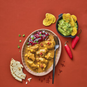 Morceaux d'épaule de porc origine France mijotés dans une sauce mexicaine à base de pulpe de tomates au jus, crème fraîche, oignons préfrits, grains de maïs, poivrons rouges ainsi que du jus de citron vert, paprika et du piment fort.