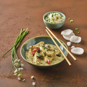 Filet de poulet émincé accompagné d'une sauce au lait de coco, pâte de curry vert, jus de citron vert et agrémenté de chou kale, d'aubergines grillées et de poivrons rouges