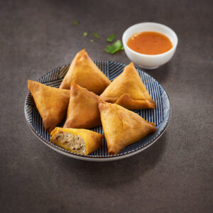 Les Samossas sont d’inspiration Indiennes et composés à partir d’une galette de blé pliée en triangle, garnie d’une farce légèrement épicée à base de boeuf origine France, d’oignon, de curry et d’épices. Samossa de 25g + sauce aigre-douce 20g.